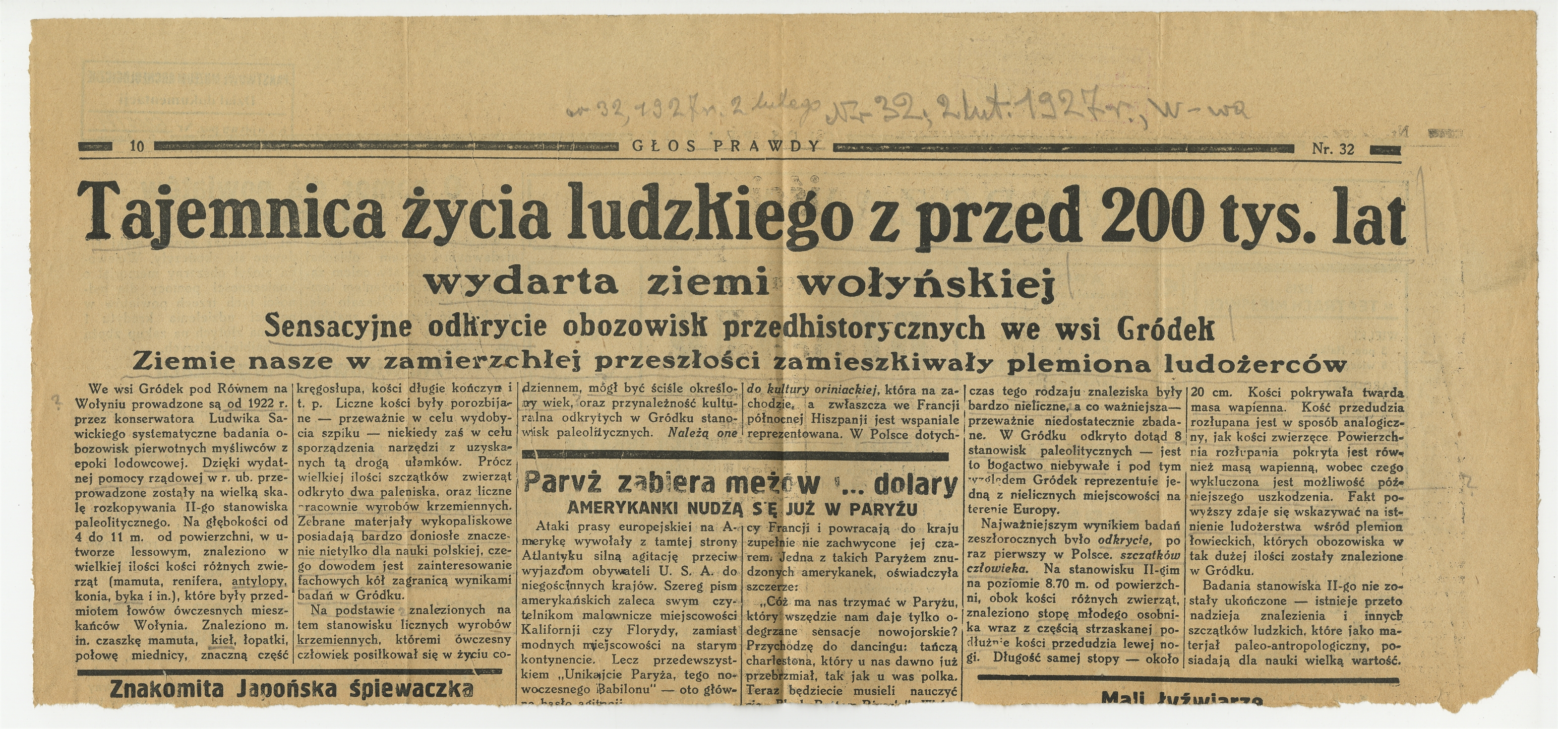Wycinek prasowy z czasopisma "Głos Prawdy" Nr 32 z dnia 2 lutego 1927 roku z notatką prasową pt.: "Tajemnica życia ludzkiego z przed 200 tys. lat"