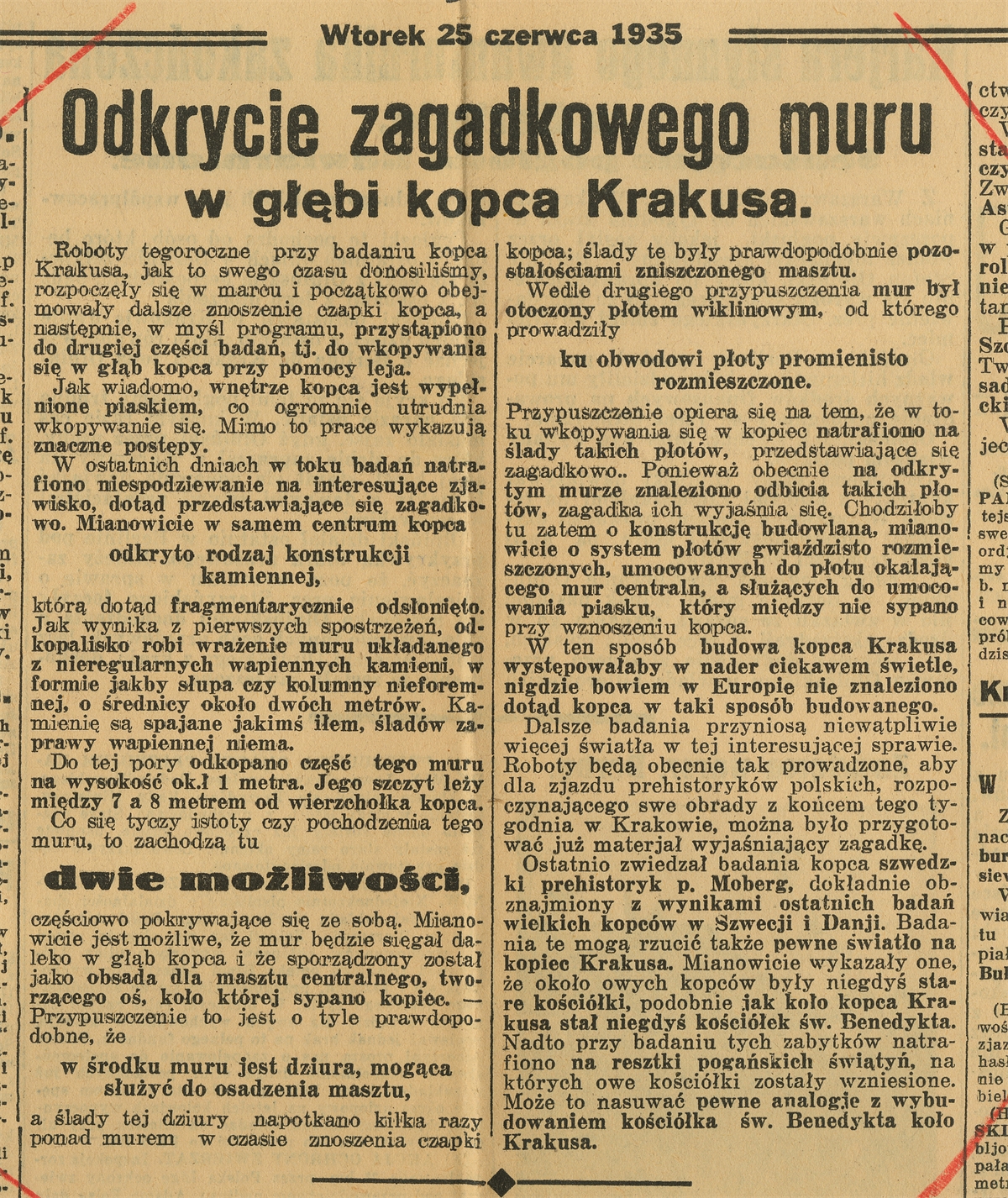 Wycinek prasowy z czasopisma "Ilustrowany Kuryer Codzienny" z dnia 25 czerwca 1935 roku z notatką prasową pt.:"Odkrycie zagadkowego muru w głębi kopca Krakusa"