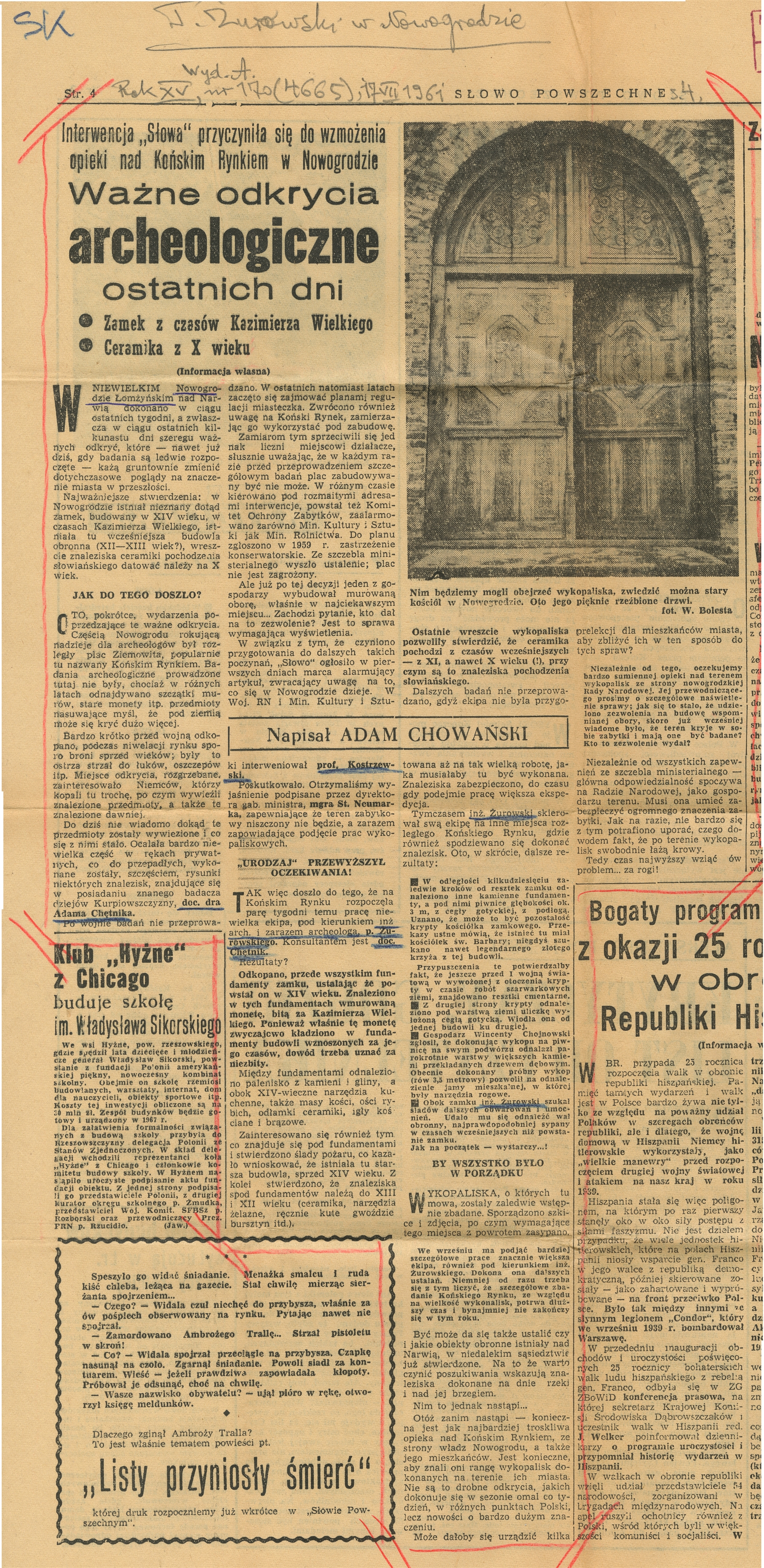 Wycinek prasowy z czasopisma "Slowo Powszechne" Nr 170 (4665) z dnia 17 VII 1961 roku z artykułem Adama Chowańskiego pt.:"Ważne odkrycie archeologiczne ostatnich dni" o badaniach w Nowogrodzie nad Narwią