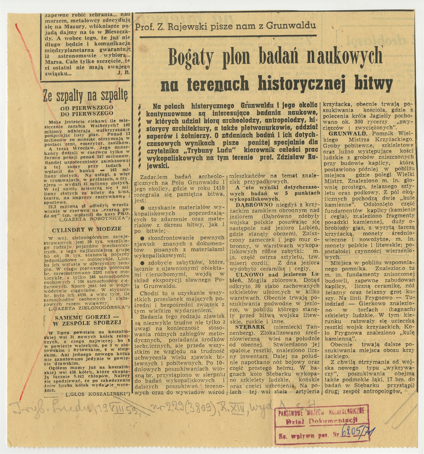 Wycinek prasowy z czasopisma "Trybuna Ludu" Nr 229 z dnia 19 VIII [19]59 roku z notatką prasową pt.: "Bogaty plon badań naukowych na terenach historycznej bitwy"