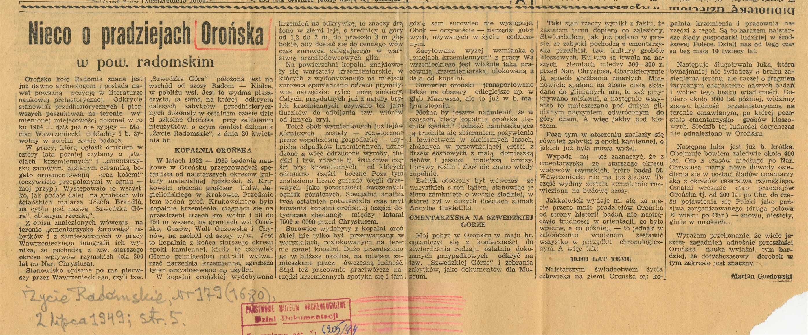 Wycinek prasowy z czasopisma "Życie Radomskie" nr 179 (1690) 2 lipca 1949 r; str. 5 z notatką prasową pt.: "Nieco o pradziejach Orońska"