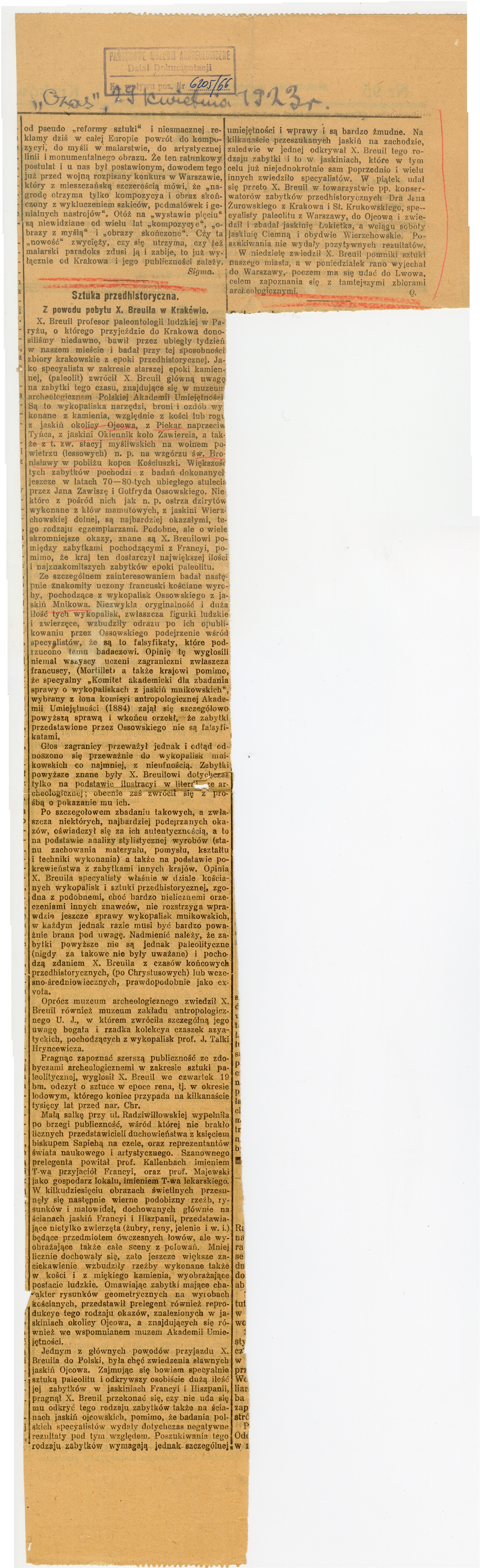 Wycinek prasowy z gazety "Czas" Nr 95 zatytułowany "Sztuka przedfistoryczna. Z powodu pobytu X. Breuila w Krakowie" 29 kwietnia 1923r.