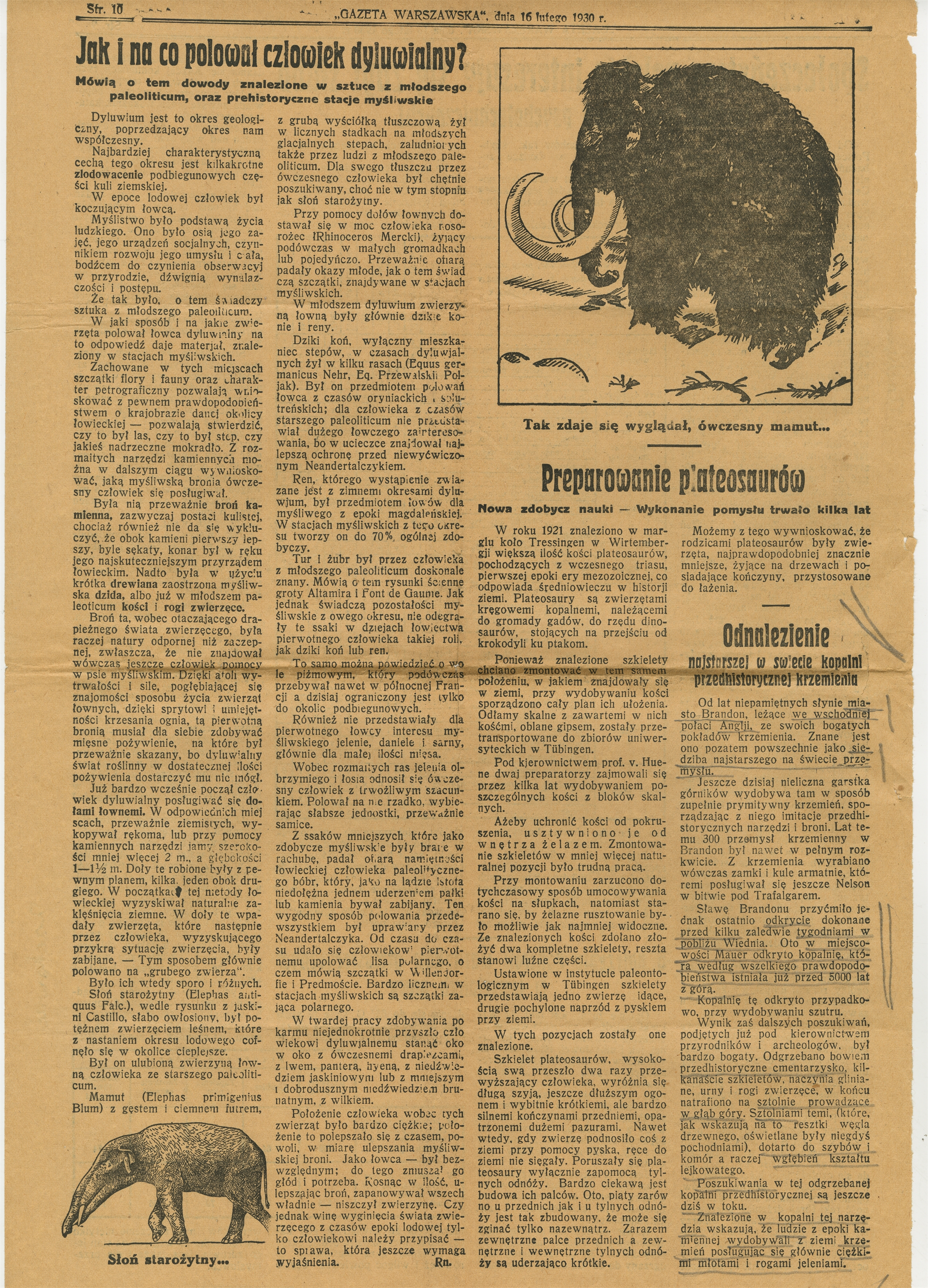Wycinek prasowy z gazety "Gazeta Warszawska" str. 10 zatytułowany "Odnalezienie najstarszej w świecie kopalni przedhistorycznej krzemienia" 16 lutego 1930r.