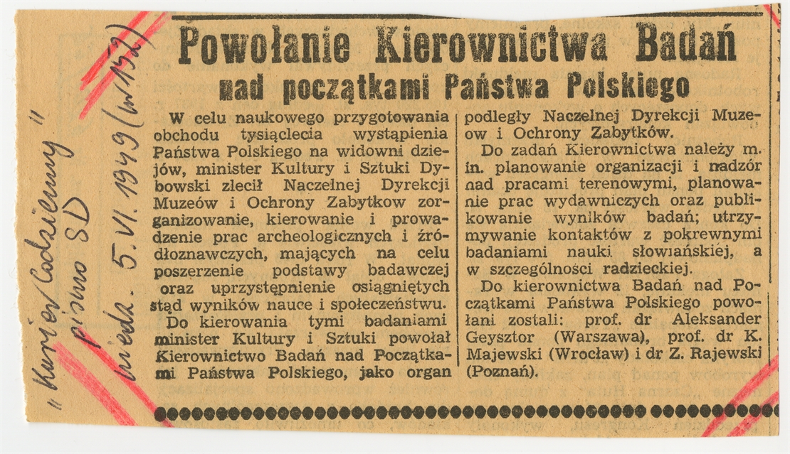 Wycinek prasowy z gazety "Kurjer Codzienny" Nr 152 z 5 czerwca 1949 r. zatytułowany "Powołanie Kierownictwa Badań nad początkami Państwa Polskiego"