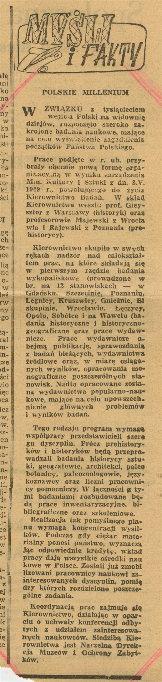 Wycinek prasowy z gazety "Kurjer Codzienny" Nr 157 z 11 czerwca 1949 r. str 3 zatytułowany "Myśli i Fakty. Polskie Millenium"