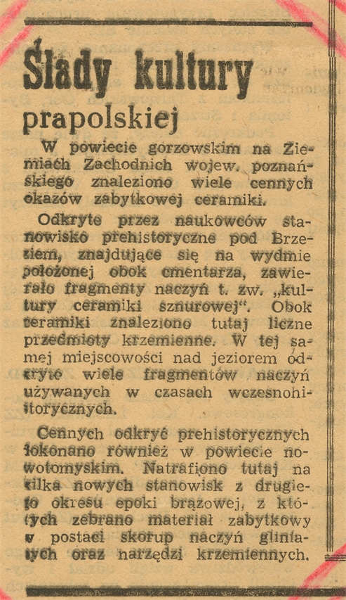 Wycinek prasowy z gazety "Kurjer Codzienny" Nr 204 z 28 lipca 1949 r. str 3 zatytułowany "Ślady kultury prapolskiej"