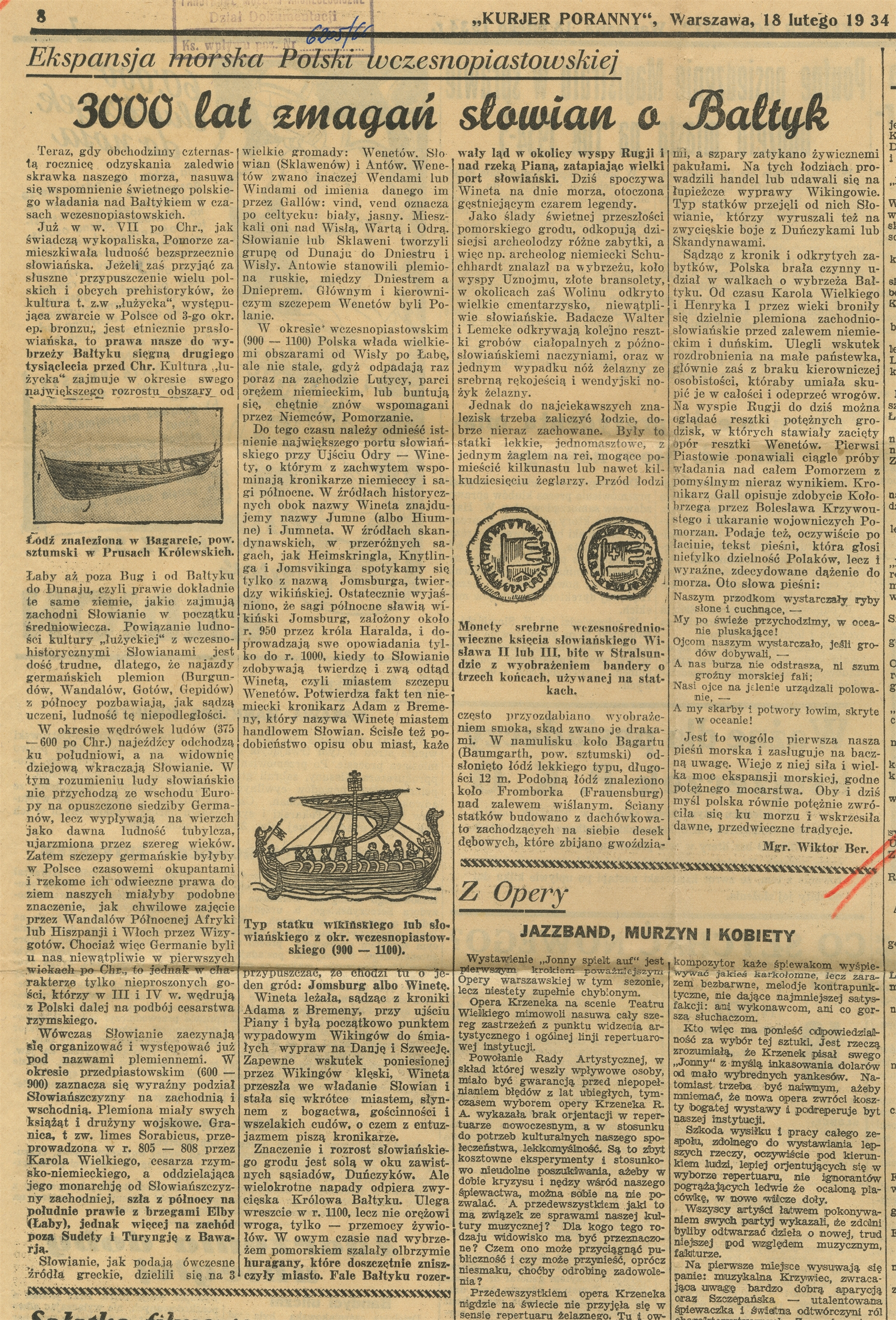 Wycinek prasowy z gazety "Kuryer Poranny" z 18 lutego 1934 r. zatytułowany "Ekspansja morska Polski wczesnopiastowskiej. 3000 lat zmagań słowian o Bałtyk."