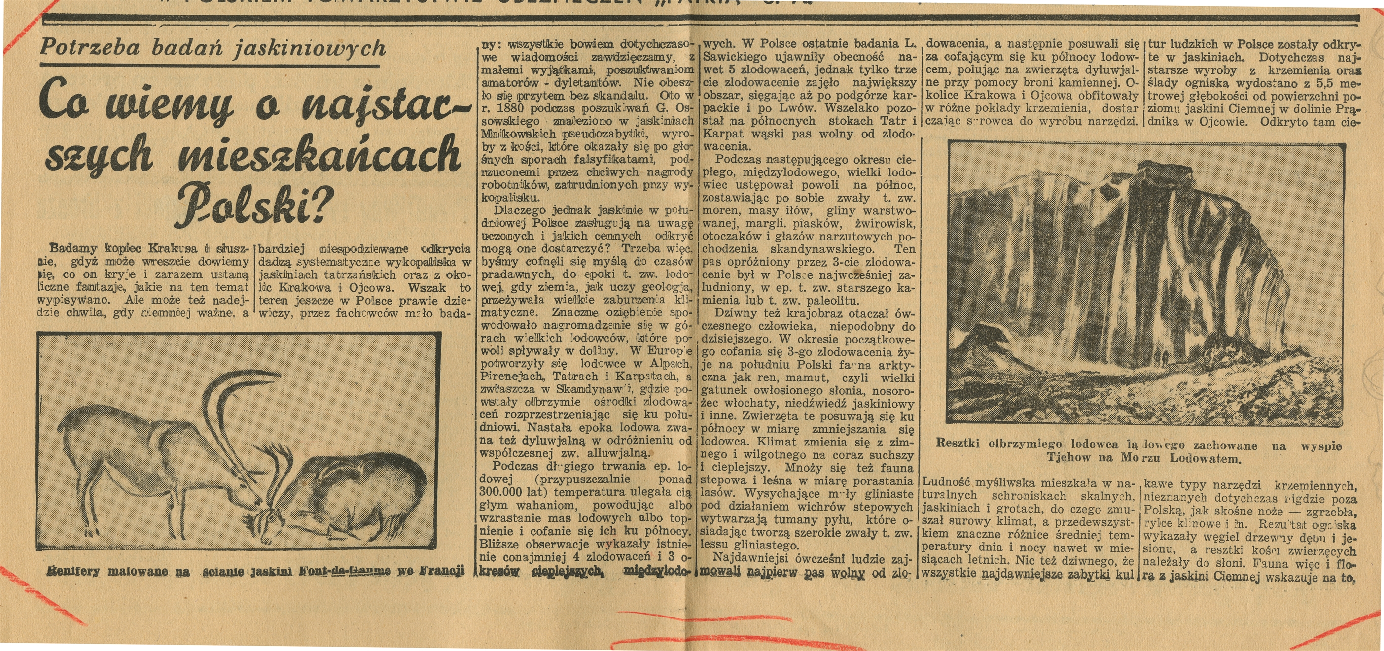 Wycinek prasowy z gazety "Kuryer Poranny" z 6 marca 1935 r. str 3 zatytułowany "Potrzeba badań jaskiniowych. Co wiemy o najstarszych mieszkańcach Polski"