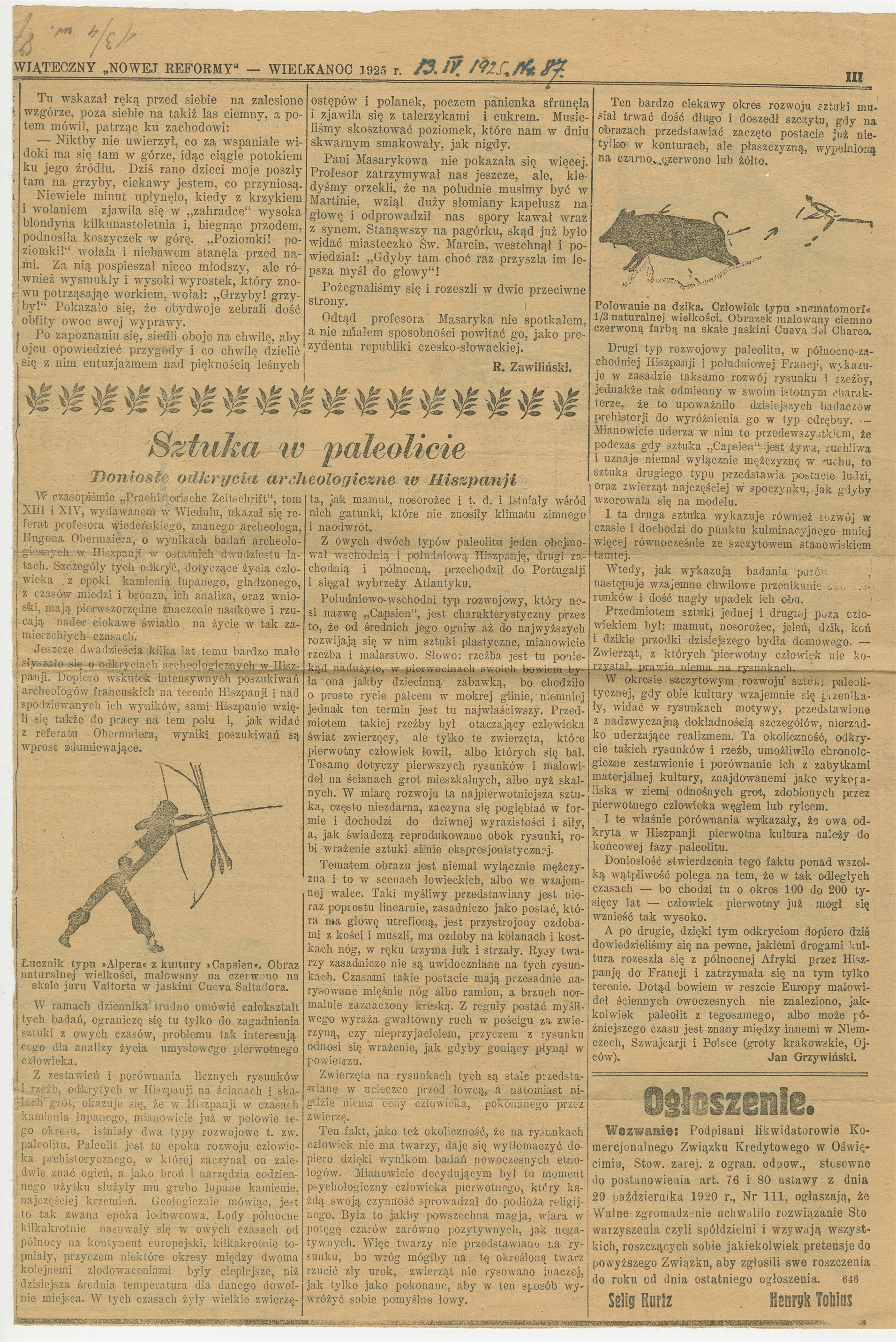 Wycinek prasowy z gazety "Nowa Reforma" Nr 87 str III zatytułowany "Sztuka w paleolicie. Doniosłe odkrycia archeologiczne w Hiszpanji" 19 IV 1925r.