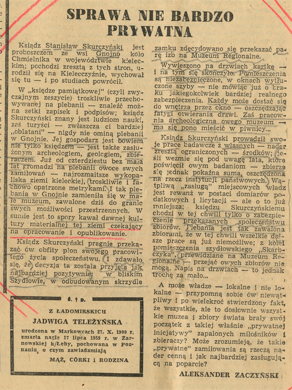 Wycinek prasowy z "Tygodnika Powszechnego" Nr 32 str. 3 zatytułowany "Sprawa nie bardzo prywatna"; 9 VIII 1959