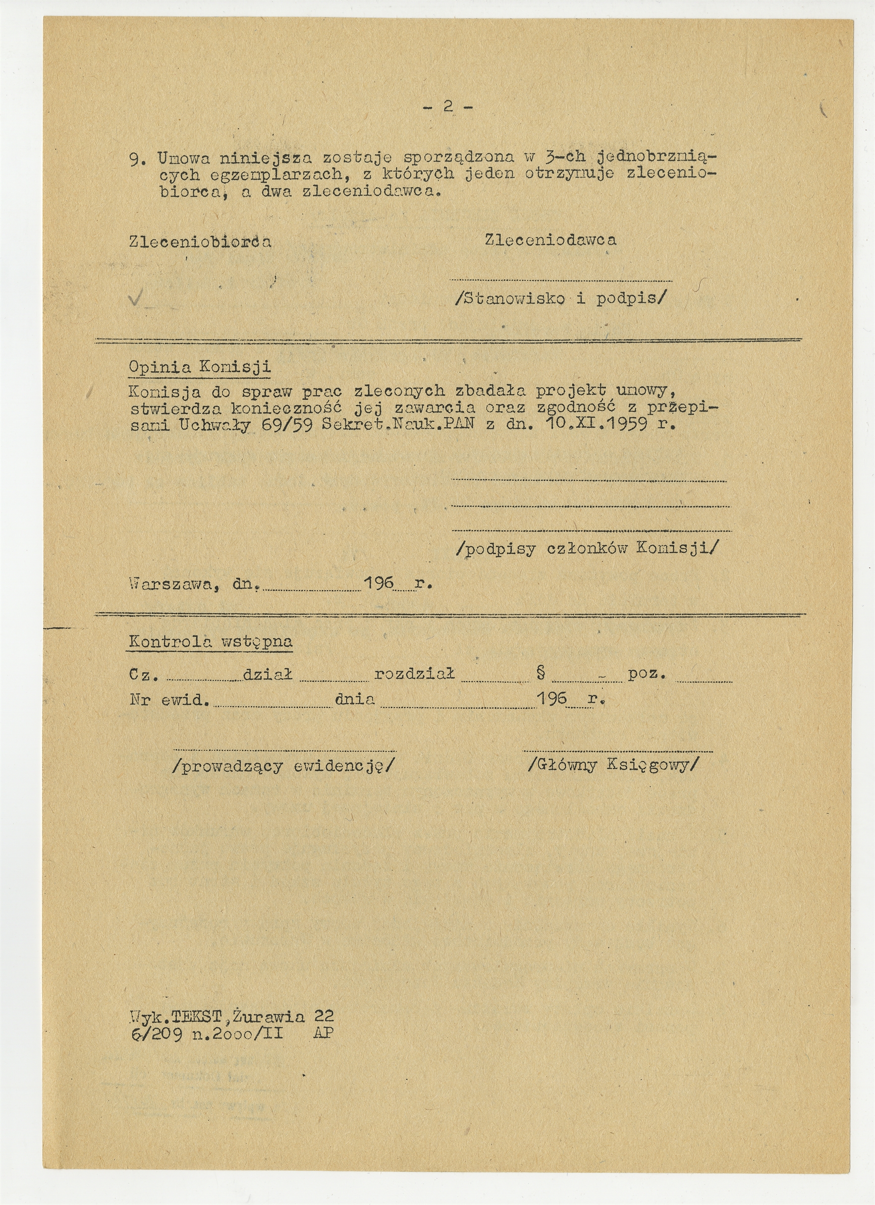 Wypełniony maszynopisem druk umowy zlecenia (o dzieło) pomiędzy Muzeum Ziemi PAN a Zofią Burcicką na wykonanie "prac artystyczno-graficznych jednobarwnych tablic całostronicowych ilustracji książkowych wyrobów kamiennych narzędzi prehistorycznych" - strona 2: "9. Umowa niniejsza" ... "/Główny Księgowy/" (strona numer 2)
