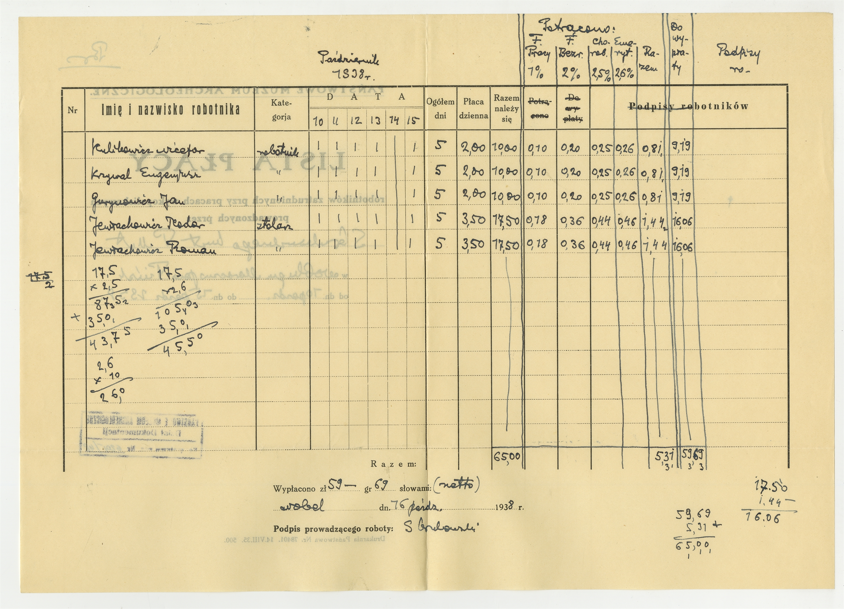 Wypełniony rękopisem druk Państwowego Muzeum Archeologicznego zatytułowany "Lista Płacy" robotników zatrudnionych przy pracach wykopaliskowych prowadzonych przez S. Krukowskiego w Noblu gm. Maraczno pow. Pińsk - strona 2: tabela - "Kulikiewicz Nicefor" … "Jewrachowicz Roman" 16 października 1938