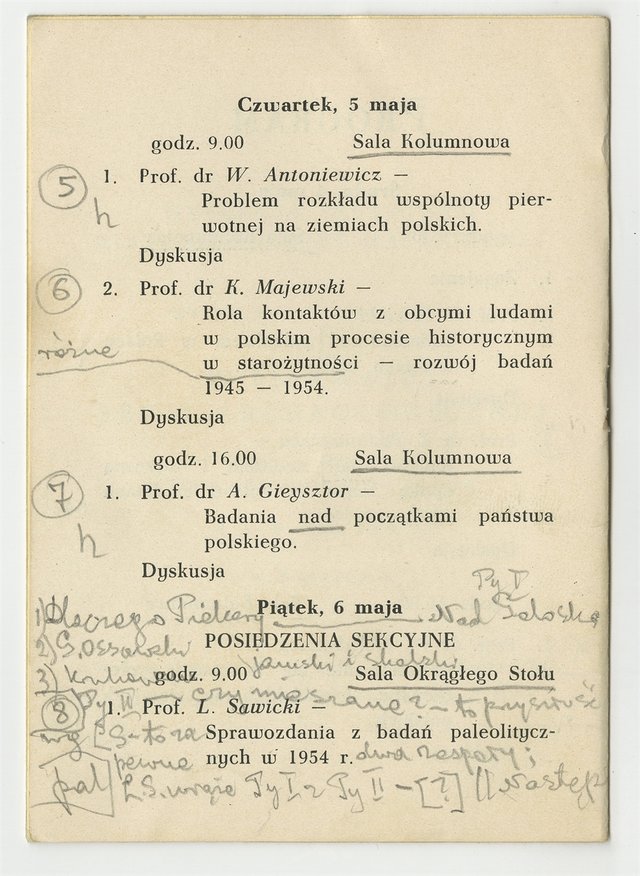 Zaproszenie z Państwowej Akademii Nauk do wzięcia udziału w Pierwszej Sesji Archeologicznej 4 - 8 V 1955 r. program czwartek 5 maja i piątek 6 maja podkreślenia i notatki prof. Stefana Krukowskiego