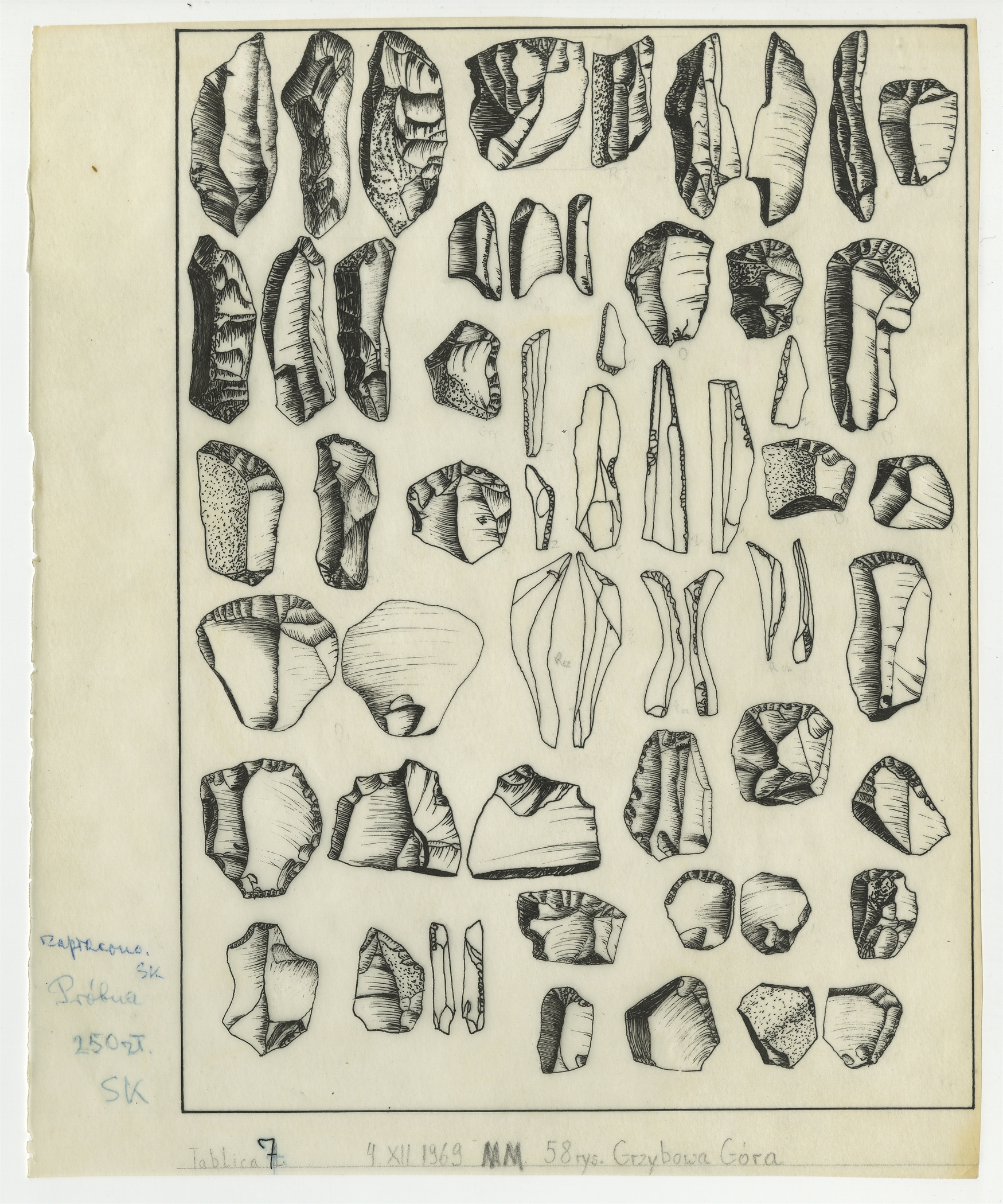 Zbiór 11 tablic próbnych zawierających rysunki zabytków krzemiennych o nieznanej proweniencji wykonane na kalce przez Z. Burcicką oraz Marka Młynarskiego w latach 1969-1970 - strona 8: "Tablica 7" sporządzona przez Marka Młynarskiego 4 XII 1969 r. (zabytki z Góry Grzybowej?)