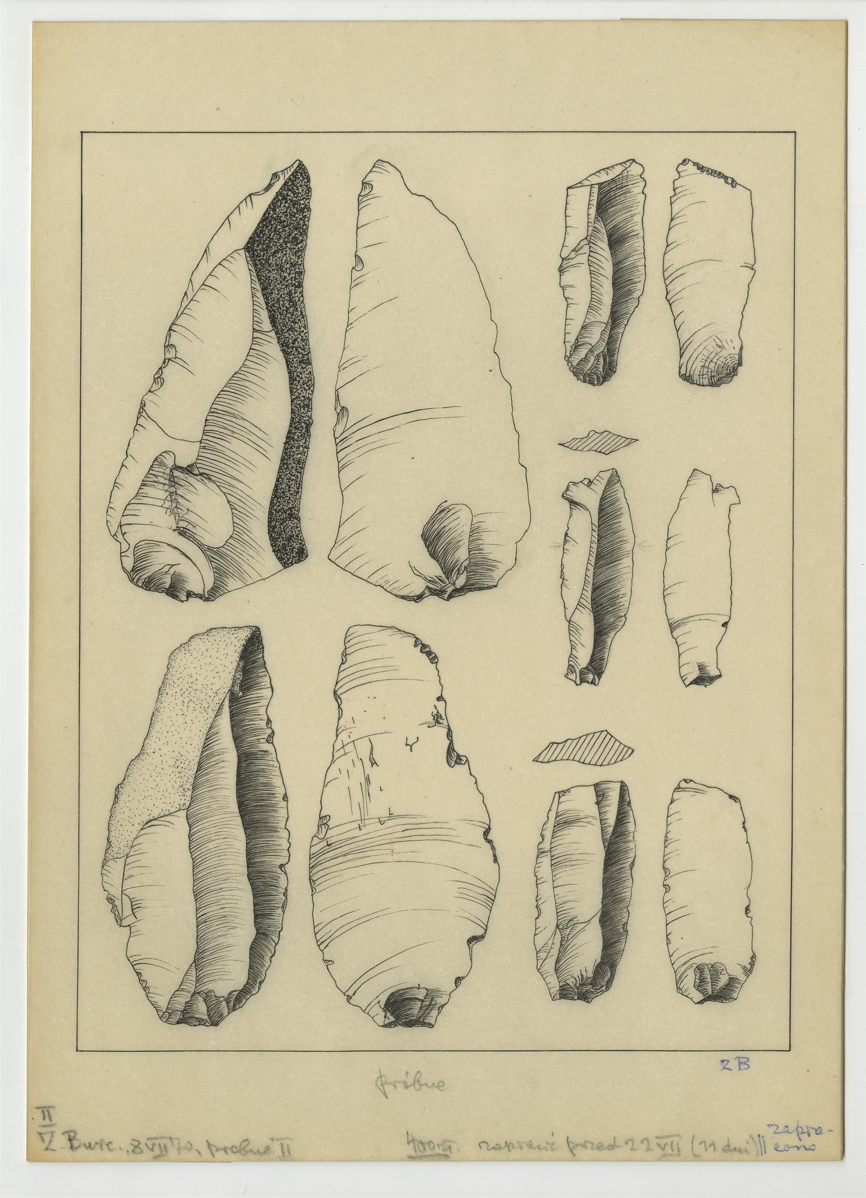 Zbiór 25 tablic próbnych zawierających rysunki zabytków krzemiennych o nieznanej proweniencji wykonanych na kalkach w latach 1969-1975 - tablica 12: "próbne II" autorstwa Zofii Burcickiej 8 VII [19]70r.