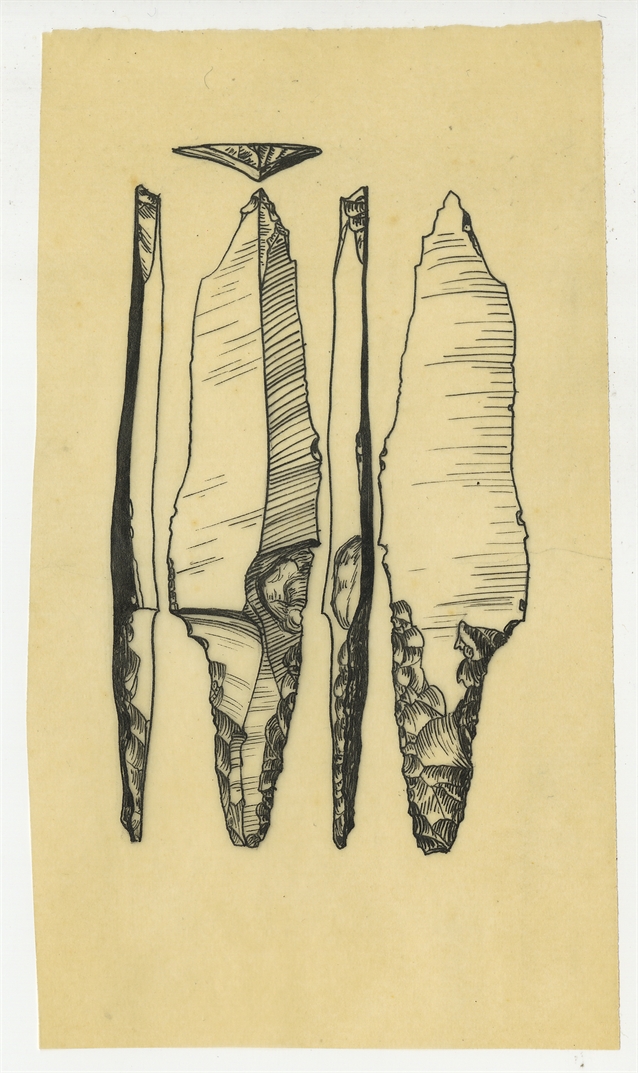 Zbiór rysunków zabytków krzemiennych (15 szt.) wykonanych ręką NN na 15 kalkach stanowiących materiał ilustracyjny do pracy naukowej Stefana Krukowskiego pt. "Przemysł płudzki" - rysunek 15: 1 zabytek krzemienny w pięciu rzutach