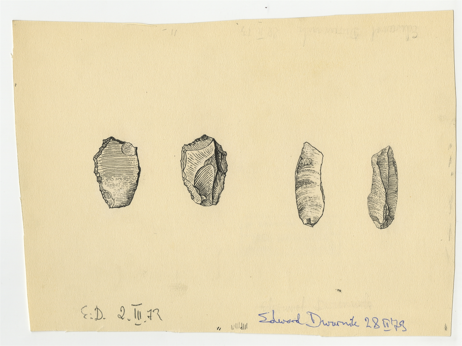 Zbiór rysunków zabytków krzemiennych o nieznanej proweniencji - strona 10: rysunek dwóch zabytków krzemiennych w dwóch rzutach wykonany przez Edwarda Dwurnika 28 II [19]73 r. oraz 2 III [19]73 r.