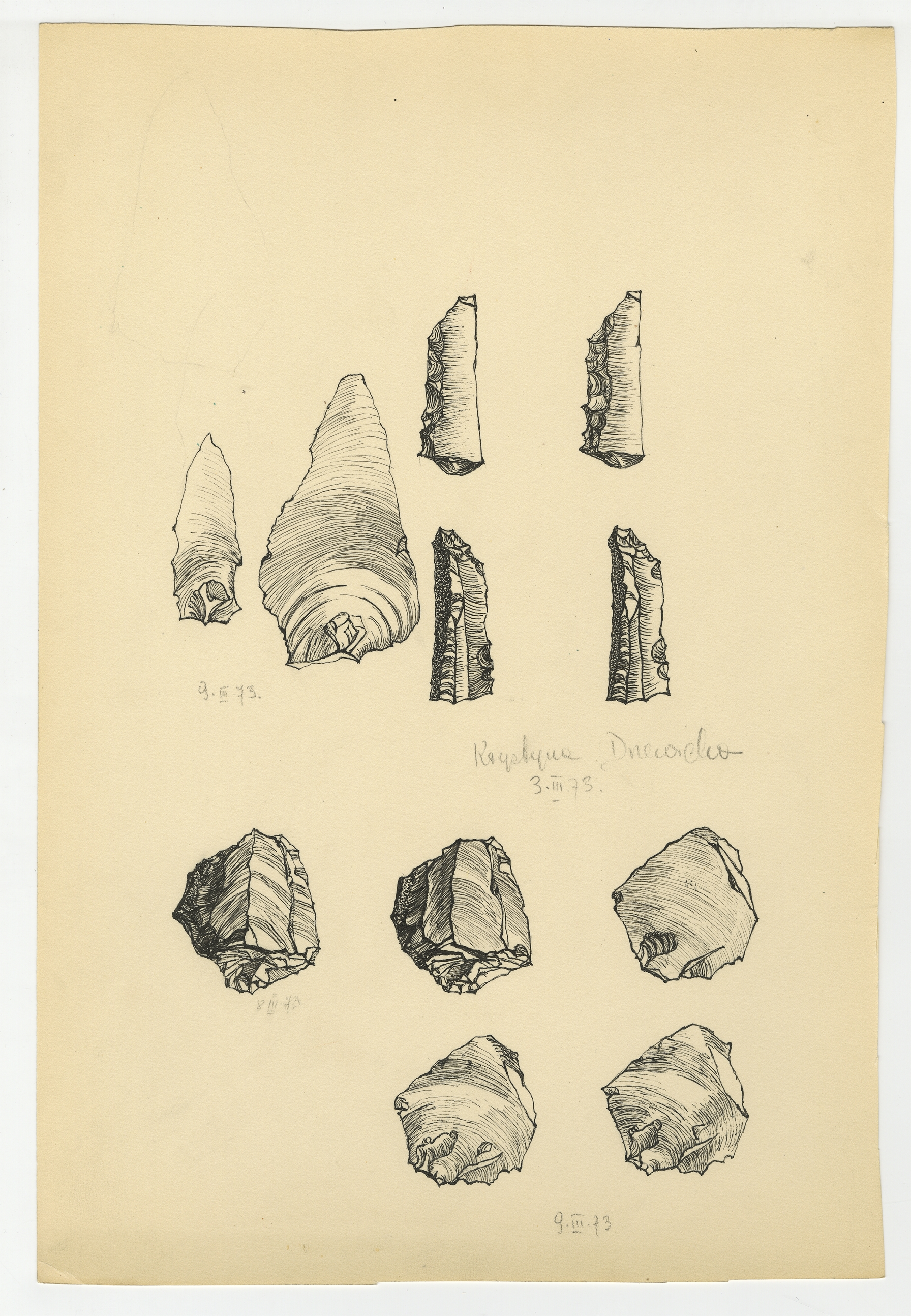 Zbiór rysunków zabytków krzemiennych o nieznanej proweniencji - strona 12: rysunki próbne czterech zabytków krzeiennych w jednym-dwóch rzutach wykonane przez Krystynę Drzewicką w okresie 3-9 III [19]73 r.