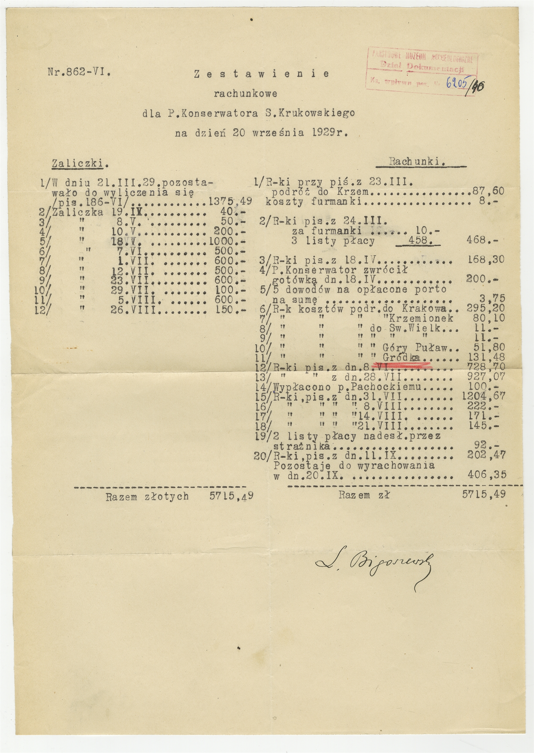 Zestawienie rachunkowe na dzień 20 września [19]29 od L. Bigoszewskiego dla prof. Stefana Krukowskiego